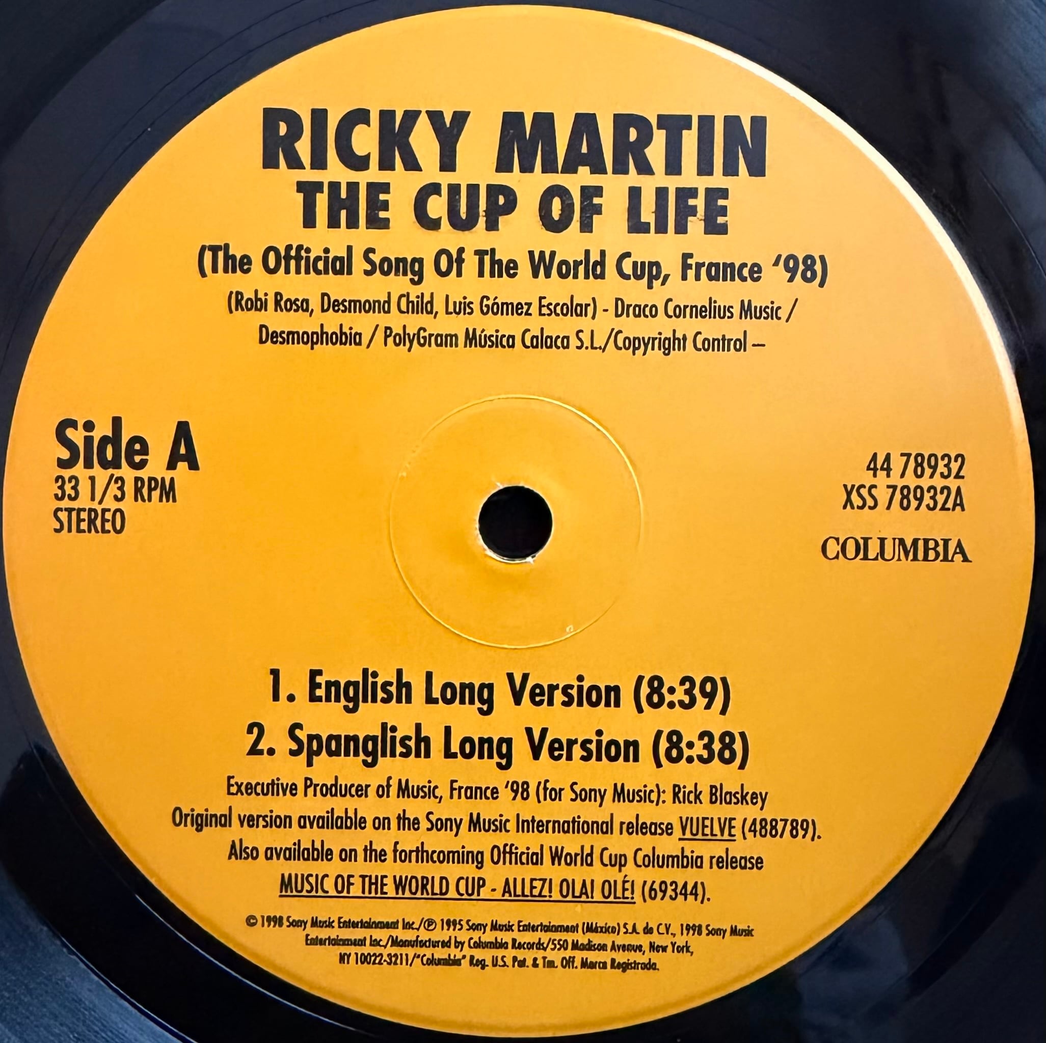 1998年フランスW杯の公式ソングとして世界的メガヒットとなった Ricky Martin「The Cup Of Life」 のUS盤12インチ。